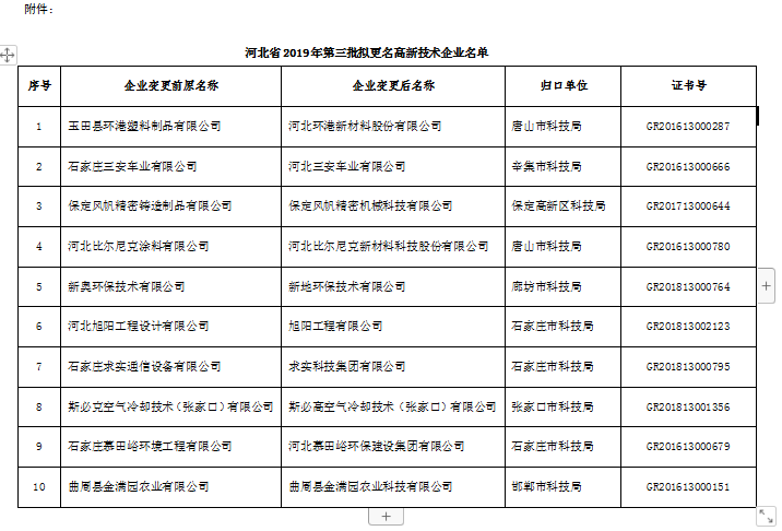 關于對河北省2019年第三批擬更名高新技術企業進行公示的通知