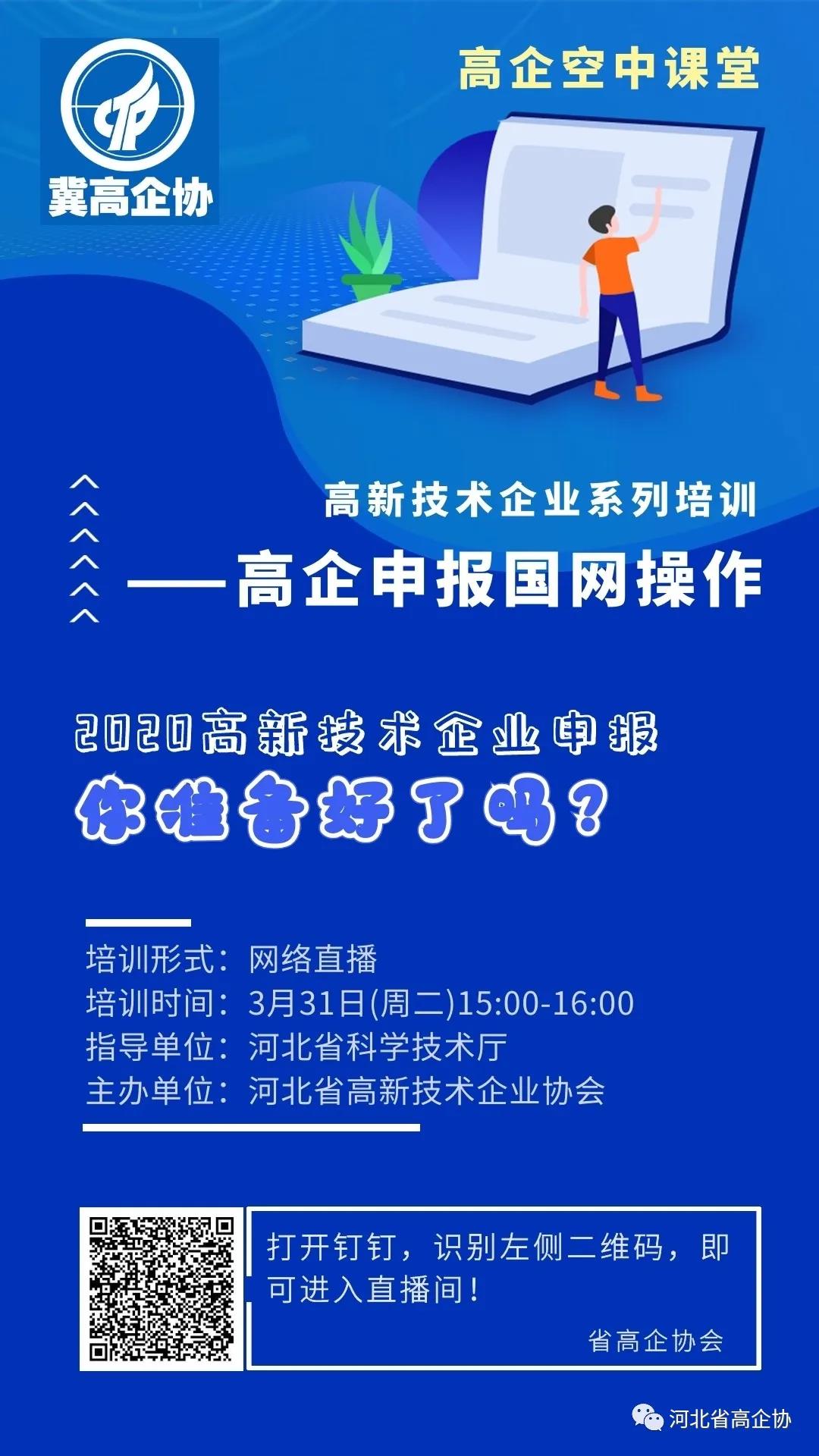 為幫助企業更好地了解高新技術企業申報要求,解決材料組織中遇到的問題,由省科技廳指導、省高新技術企業協會主辦的“高企申報國網操作”培訓將于3月31日(周二)15:00-16:00通過釘釘,進行網絡直播,歡迎大家掃碼收聽!
